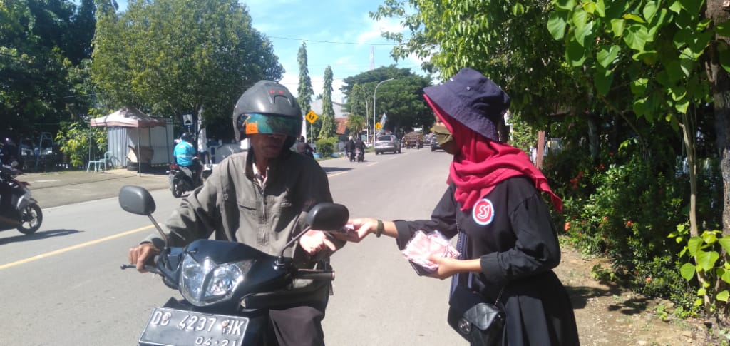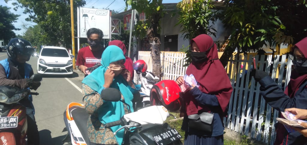 SINJAI, Suara Jelata—Jajaran redaksi media online Suarajelata.com membagikan masker gratis kepada para penguna jalan di Jalan Persatuan Raya, Depan Kantor Diskominfo (Tugu Bambu Sinjai). Kamis, (9/4/2020).
