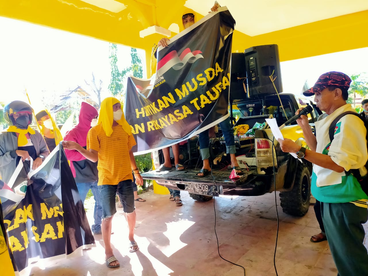 “Kami akan boikot Kantor Golkar sampai hari Minggu, kami akan aksi sampai hari Minggu, kami tolak pelaksanaan Golkar yang cacat prosedur dan penuh rekayasa,” kuncinya.