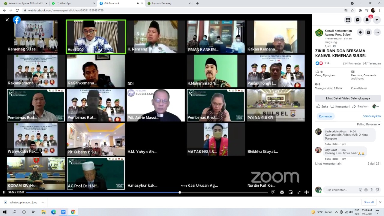 Acara yang diinisiasi oleh Kanwil Kemenag Sulsel ini diikuti oleh ribuan partisipan di Live Zoom dan penonton di streaming media sosial Kemenag Sulsel, termasuk para pimpinan dan Jajaran Forum Komunikasi Pimpinan Daerah (Forkpimda) Provinsi Sulsel, diantaranya Plt. Gubernur, Ketua DPRD, Kapolda, Pangdam XIV Hasanuddin, Kejaksaan Tinggi serta Tokoh dan Ormas Lintas Agama se-Sulsel dengan konsep Pray From Home atau berdoa dari rumah.