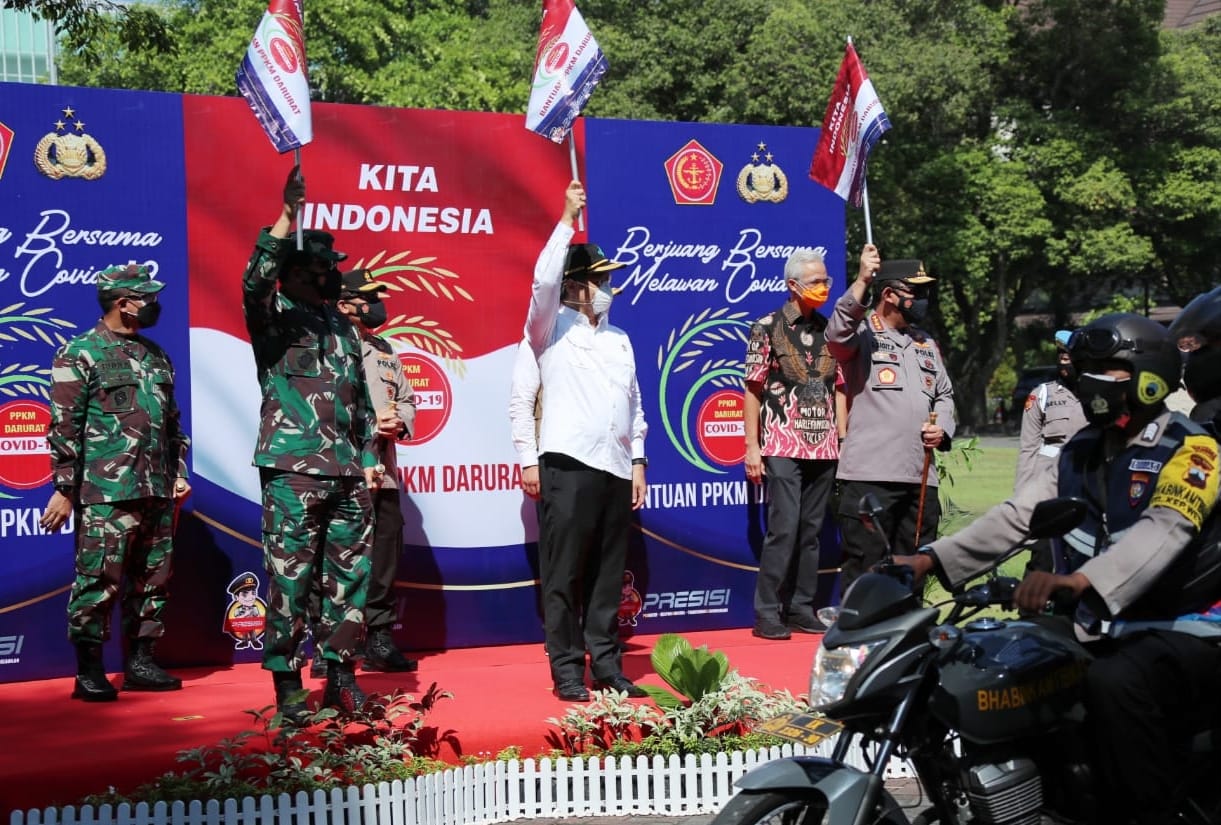 SOLO, Suara Jelata— Menteri Kesehatan Budi Gunadi Sadikin, Panglima TNI Marsekal Hadi Tjahjanto dan Kapolri Jenderal Listyo Sigit Prabowo mendistribusikan 30.000 paket sembako PPKM Darurat untuk masyarakat Solo, Jawa Tengah (Jateng).