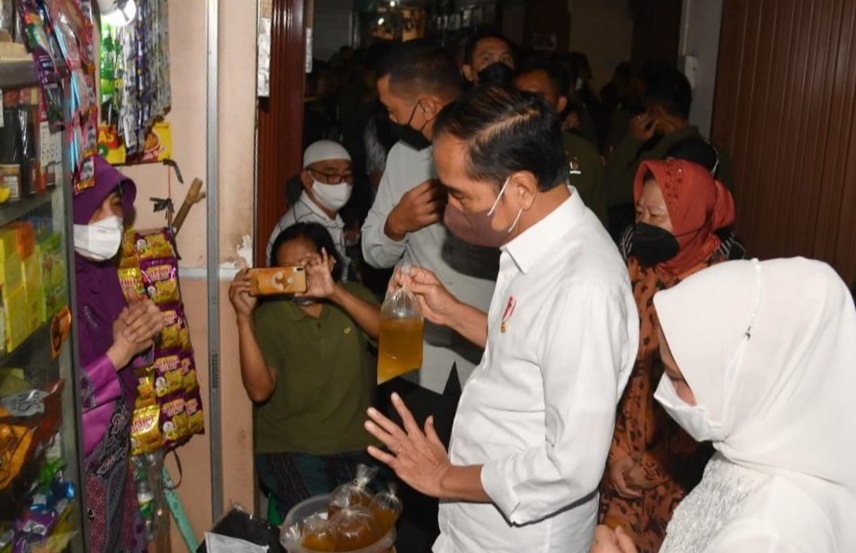 Setibanya di Pasar Muntilan, Presiden bersama Ibu Iriana langsung mengecek harga minyak goreng curah dan berdialog dengan beberapa pedagang.