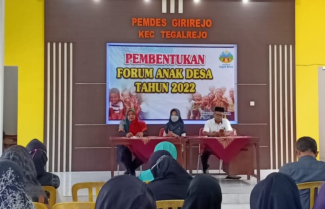 Selain itu juga sekaligus membentuk dan memberdayakan Forum Anak Desa, seperti dilakukan di Desa Girirejo, Kecamatan Tegalrejo Kabupaten Magelang, Selasa-Rabu (09-10/08/2022). Peserta terdiri dari perangkat desa, kadus, Bhabinkamtibmas, Babinsa, BPD, Kader Posyandu, TP PKK Desa, Pendidik.