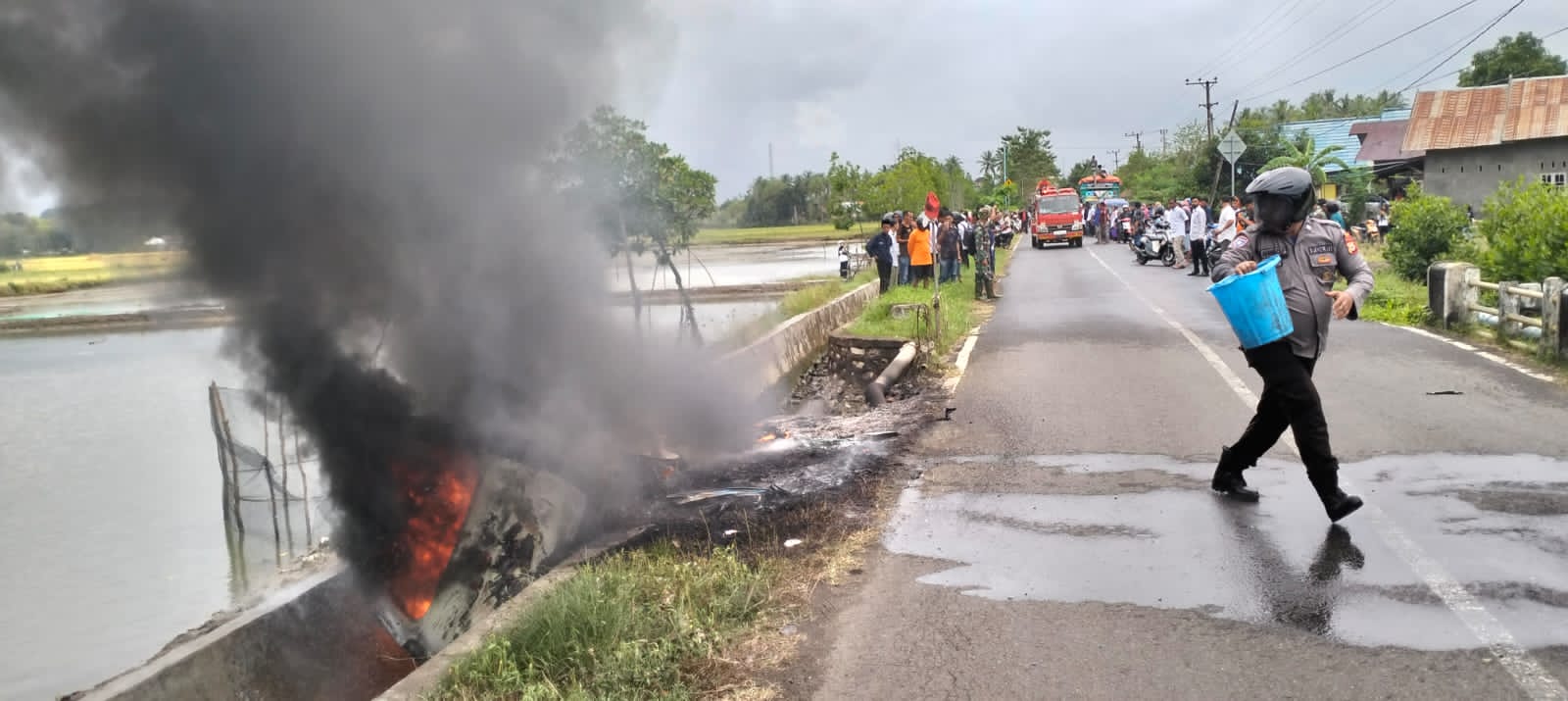 AIPTU. Ahmad Patawari, sigap mengambil air dari sungai yang dekat dari TKP dengan menggunakan ember untuk menyiram mobil yang terbakar itu.