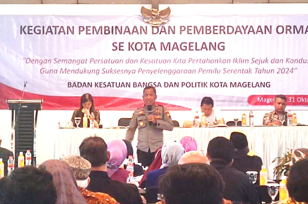 Kegiatan tersebut mengusung tema “Dengan Semangat Persatuan dan Kesatuan Kita Pertahankan Iklim Sejuk dan Kondusif Guna Mendukung Suksesnya Penyelenggaraan Pemilu Serentak Tahun 2024”. Pembinaan Ormas ini diselenggarakan oleh Kesbangpol Kota Magelang.
