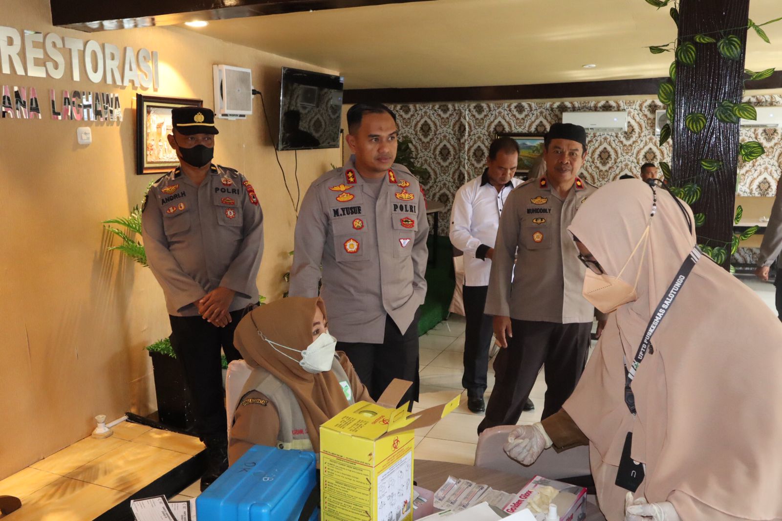 Dalam kegiatan tersebut, Kapolres Soppeng Kapolres Soppeng AKBP Dr. (C) H. Muhammad Yusuf Usman S.H., S.I.K.,M.T didampingi Wakapolres Soppeng Kompol H. Muhiddin Yunus S.H M.H beserta Kasi Dokkes Ipda Andri Hermansyah S.Sos turut memantau pelaksanaan Vaksinasi.