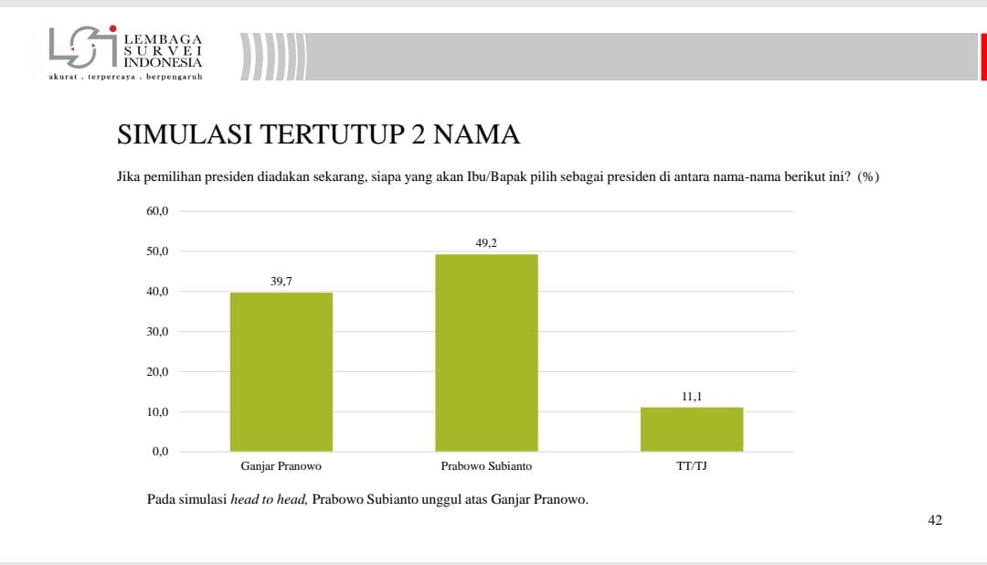 LSI mengungkapkan, jika pemilihan dilakukan saat ini, secara spontan, Prabowo menjadi sosok yang paling banyak dipilih dengan persentase sebesar 18,3%, disusul oleh Ganjar Pranowo pada angka 16,2%, dan yang ketiga adalah Anies dengan perolehan sebesar 13,1%.