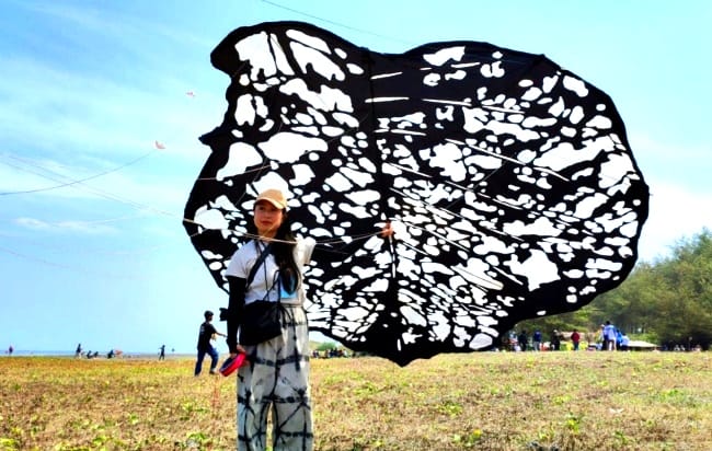 Salah satu peserta asal Tokyo Jepang, Yoh Yasuda (33) dengan semangat menerbangkan layang-layang buatannya sendiri di festival itu. Kali ini Yasuda merakit layang-layang berbentuk daun kering.