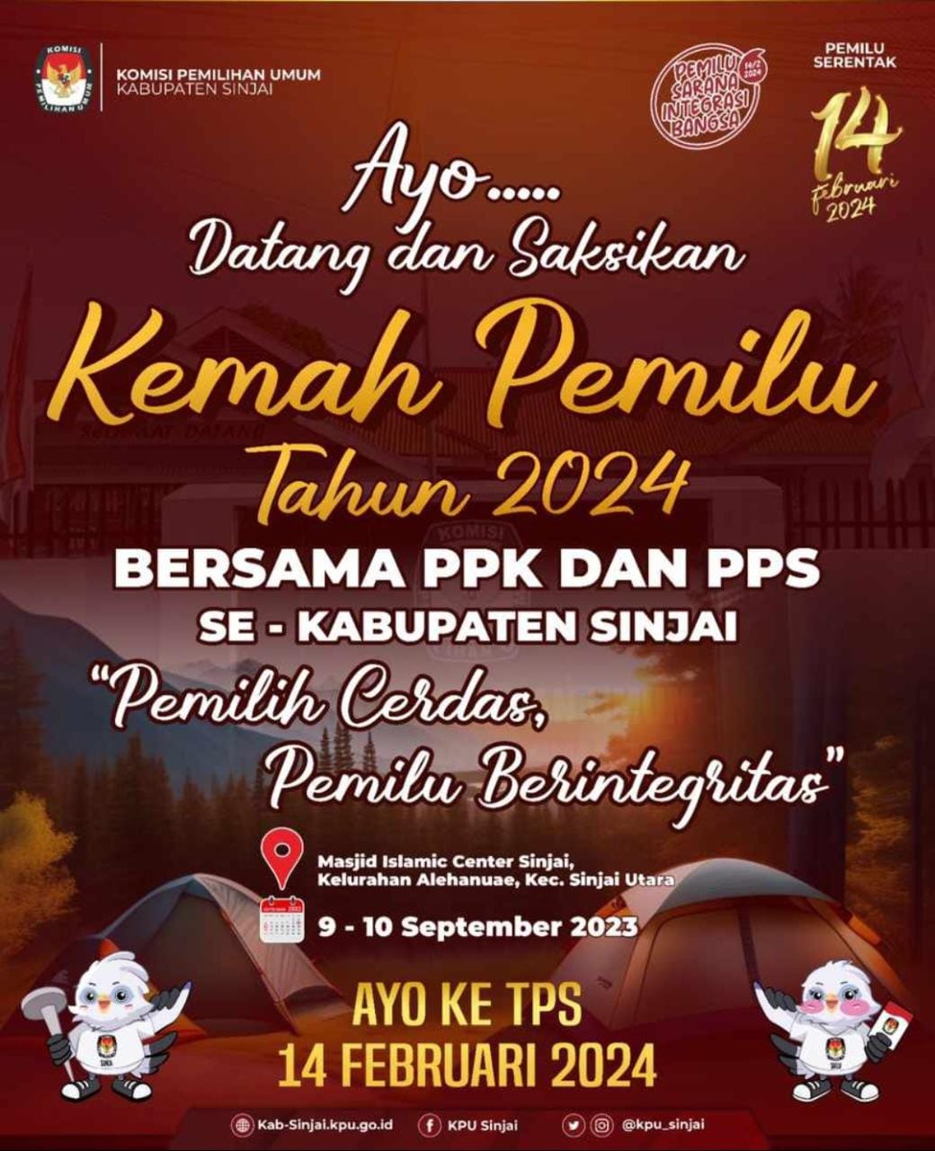 SINJAI, Suara Jelata—-Panitia Pemilihan Kecamatan (PPK) dan Panitia Pemungutan Suara (PPS) se-Kabupaten Sinjai akan menggelar Kemah Pemilu di halaman Masjid Islamic Center Tanassang, Kelurahan Alehanuae, Kecamatan Sinjai Utara pada 9-10 September 2023.