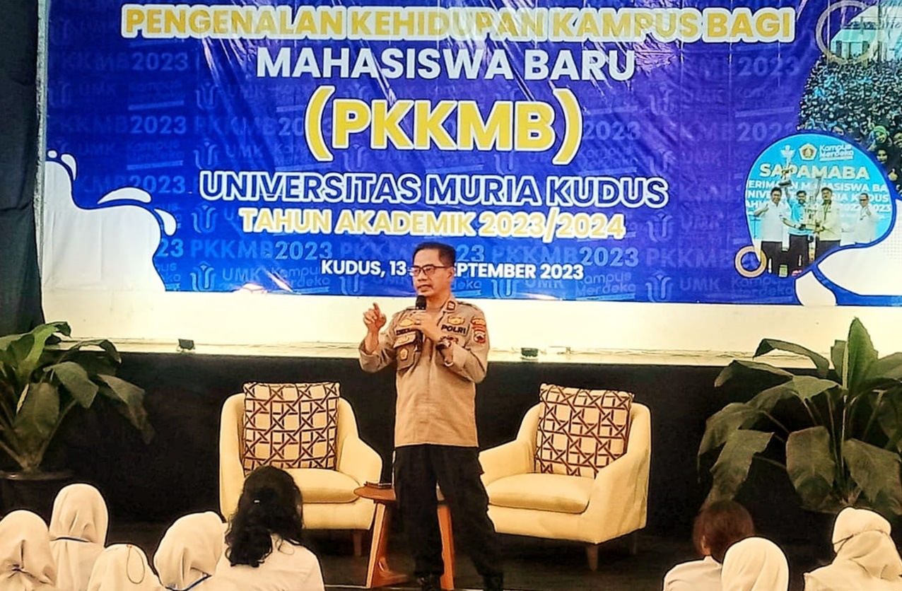 KUDUS JATENG, Suara Jelata – Kapolsek Kudus Iptu Subkhan kembali menjadi pembicara dalam Pengenalan Kehidupan Kampus bagi Mahasiswa Baru (PKKMB) di Universitas Muria Kudus (UMK). Kegiatan berlangsung di Gedung Auditorium kampus setempat, Jumat (15/09/2023).