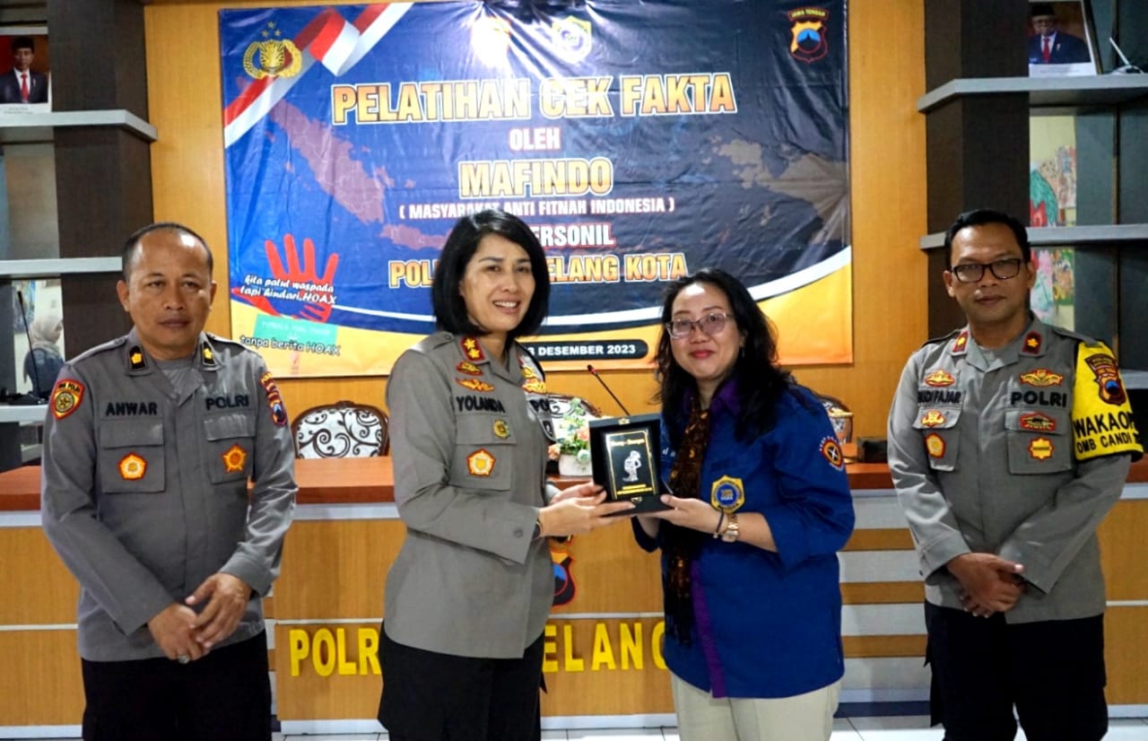 Kapolres Magelang Kota memberikan cinderamata kepada Tim MAFINDO Kota Magelang sebagai penghargaan atas partisipasi aktif dalam memberikan pelatihan Cek Fakta. Apresiasi kepada Tim MAFINDO dalam upaya meningkatkan literasi digital dan penanggulangan hoax di tengah masyarakat.