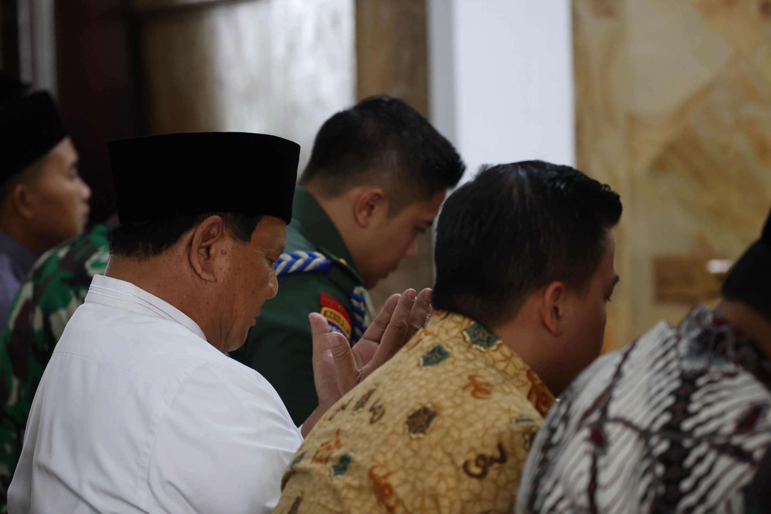 Ia melaksanakan ibadah salat Jumat bersama pegawai Kemhan. Prabowo duduk di shaf paling depan dengan baju putih dan peci hitam.