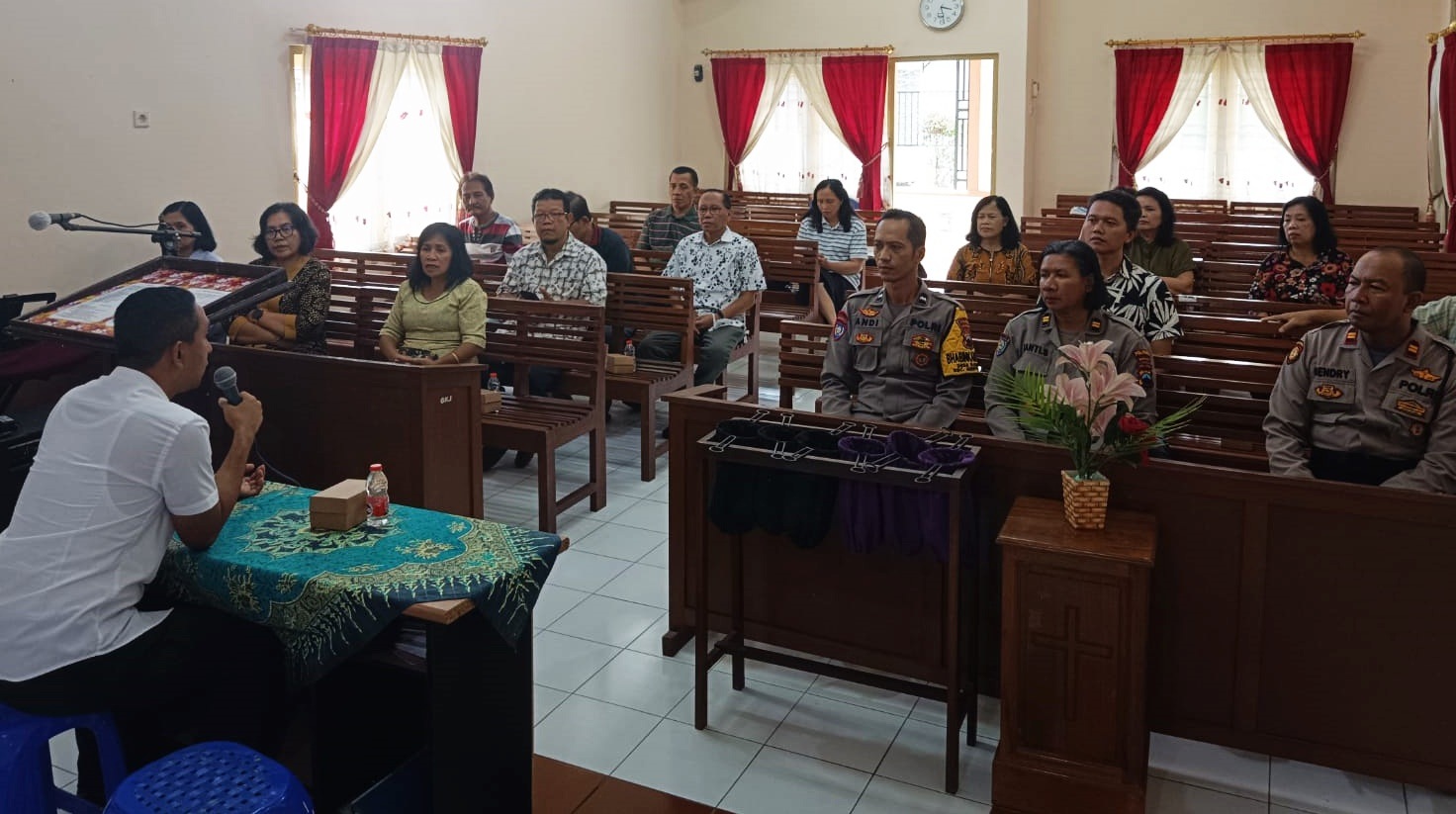 MAGELANG JATENG, Suara Jelata – Dalam rangka mendukung Program Beyond Trust Presisi Tahun 2024, Polresta Magelang menggelar Minggu Kasih. Kali ini dilaksanakan di Gereja Kristen Jawa (GKJ) Pepanthan Kalinegoro, Kecamatan Mertoyudan, Kabupaten Magelang, Minggu (17/03/2024) pagi.