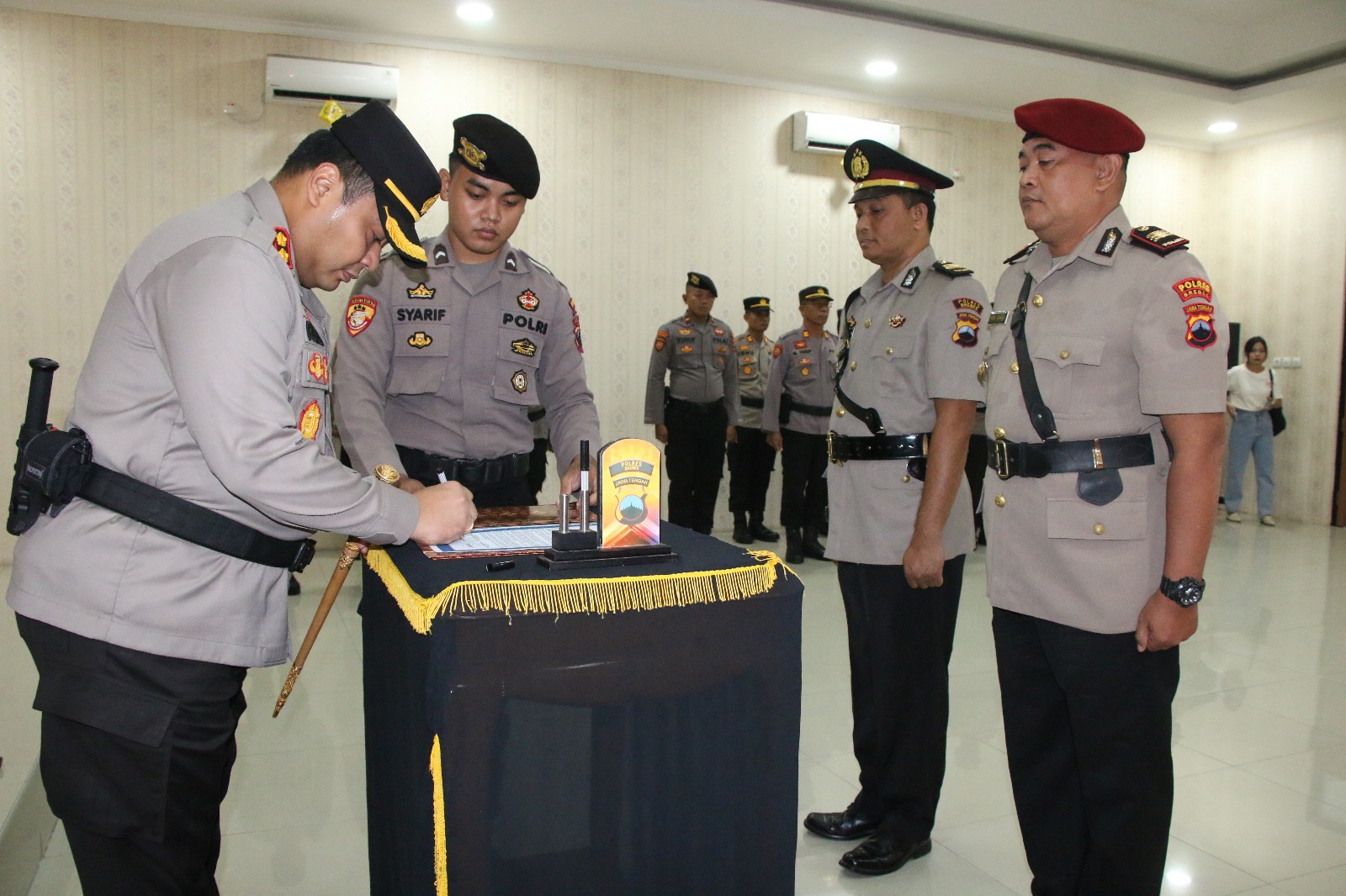 Dalam rangkaian Sertijab tersebut juga dilaksanakan penandatanagan pakta integritas serta pengambilan sumpah jabatan sebagai komitmen untuk bertugas dengan baik sesuai dengan tugas dan tanggung jawabnya sebagai pejabat Polri di lingkungan Polres Brebes.