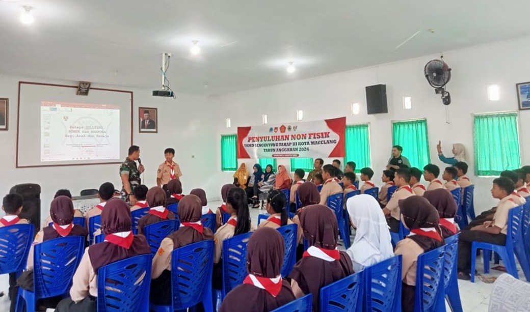 Pelajar SMP Negeri 4 Kota Magelang menerima materi Penyuluhan Non Fisik kegiatan TMMD Sengkuyung Tahap II Tahun 2024 Kodim 0705/Magelang, Jumat (09/08/2024). (foto: Narwan)