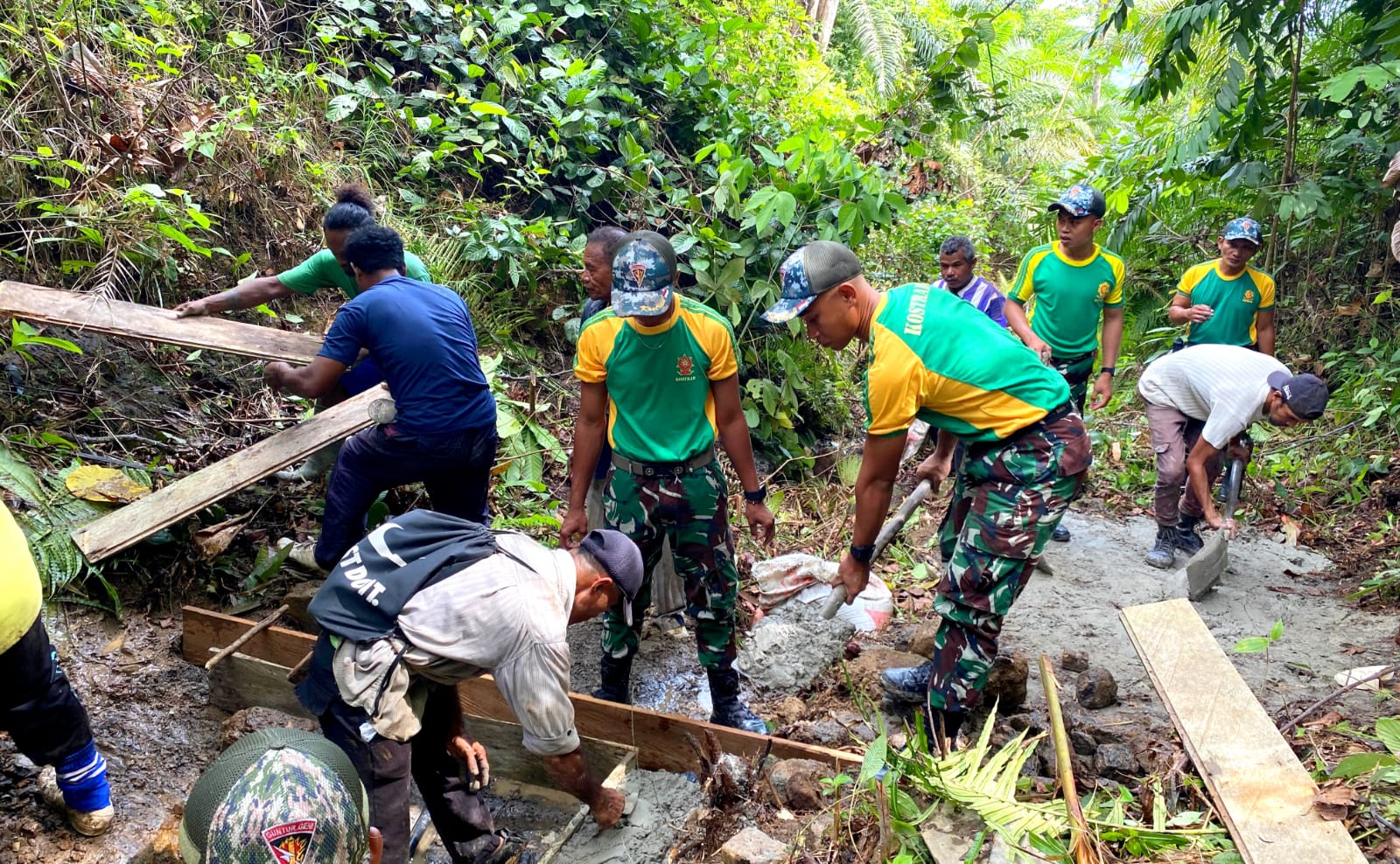 Dalam kegiatan tersebut, anggota Satgas bersama masyarakat setempat bekerja sama membangun saluran mata air yang diharapkan dapat menjadi sumber air bersih yang layak dan dapat diakses oleh warga sekitar.