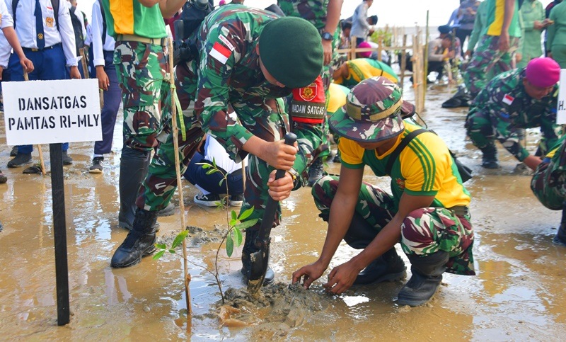 “Penanaman mangrove ini adalah bentuk nyata kepedulian kami terhadap lingkungan dan mendukung progam Bapak Kasad, TNI AD bersama rakyat bersatu dengan alam untuk NKRI. Selain untuk melindungi ekosistem pesisir, kegiatan ini juga menjadi sarana mempererat hubungan antara Satgas Pamtas dan masyarakat setempat. Kami berharap kegiatan ini dapat memberikan manfaat jangka panjang bagi lingkungan dan generasi mendatang,” ujarnya. (Nar)
