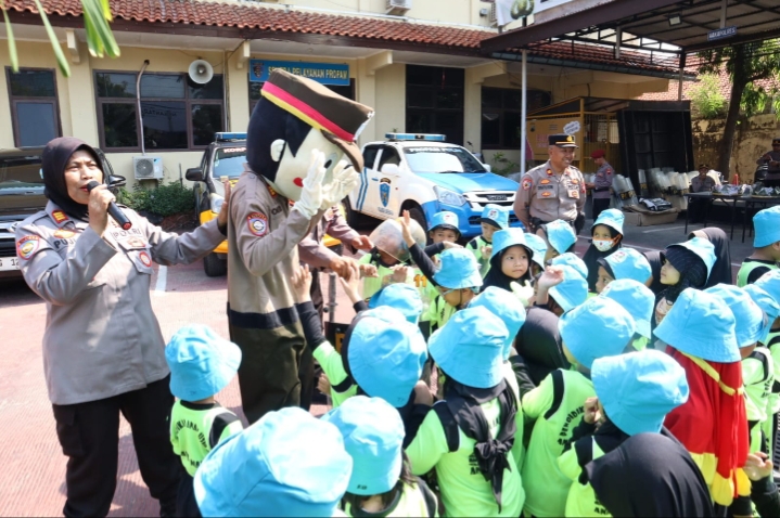 Puluhan murid Taman Kanak-Kanak (TK) Ananda Mandiri Brebes datang berkunjung dalam rangka kegiatan pembelajaran di luar kelas (outing class) sekaligus pengenalan profesi Polisi.