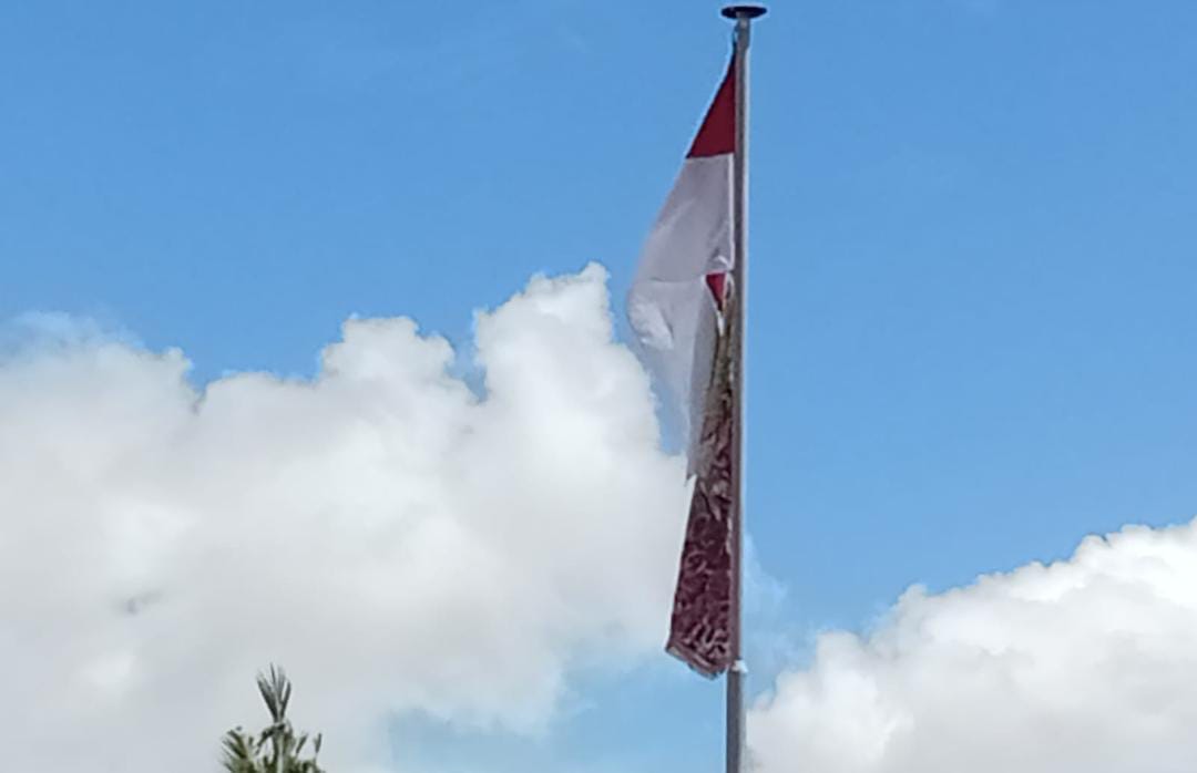 Bendera Merah Putih terlihat dikibarkan satu tiang dengan sehelai kain bermotif dan bertuliskan huruf lontara Bugis.