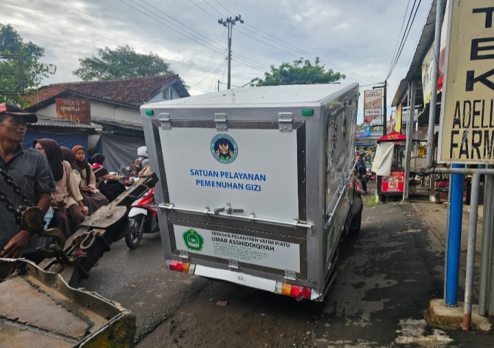 Sebuah mobil box dengan operasional nomor polisi B 9727 UAH milik salah satu SPPG di Desa Kubangsari, Kecamatan Ketanggungan, menabrak palang pembatas tinggi kendaraan di bawah jembatan rel kereta api.