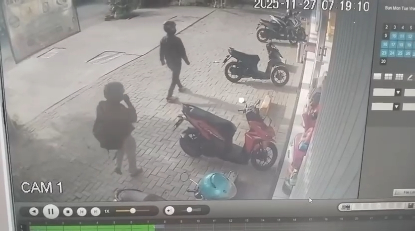 Dalam rekaman, tampak dua pria berjaket dan mengenakan helm datang ke lokasi setelah sebelumnya berbelanja di minimarket tersebut.